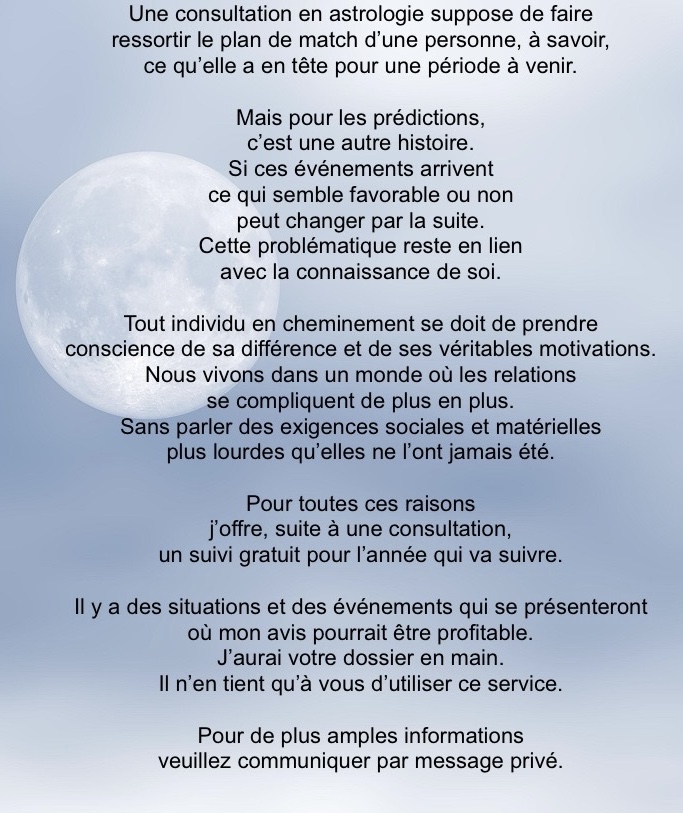 Mes blogs traitent d’une connaissance de base en astrologie, celle que j’utilise en consultation. J’espère qu’ils stimuleront votre sensibilité intuitive. J’écris régulièrement à toutes les semaines. Je vous invite à me suivre.